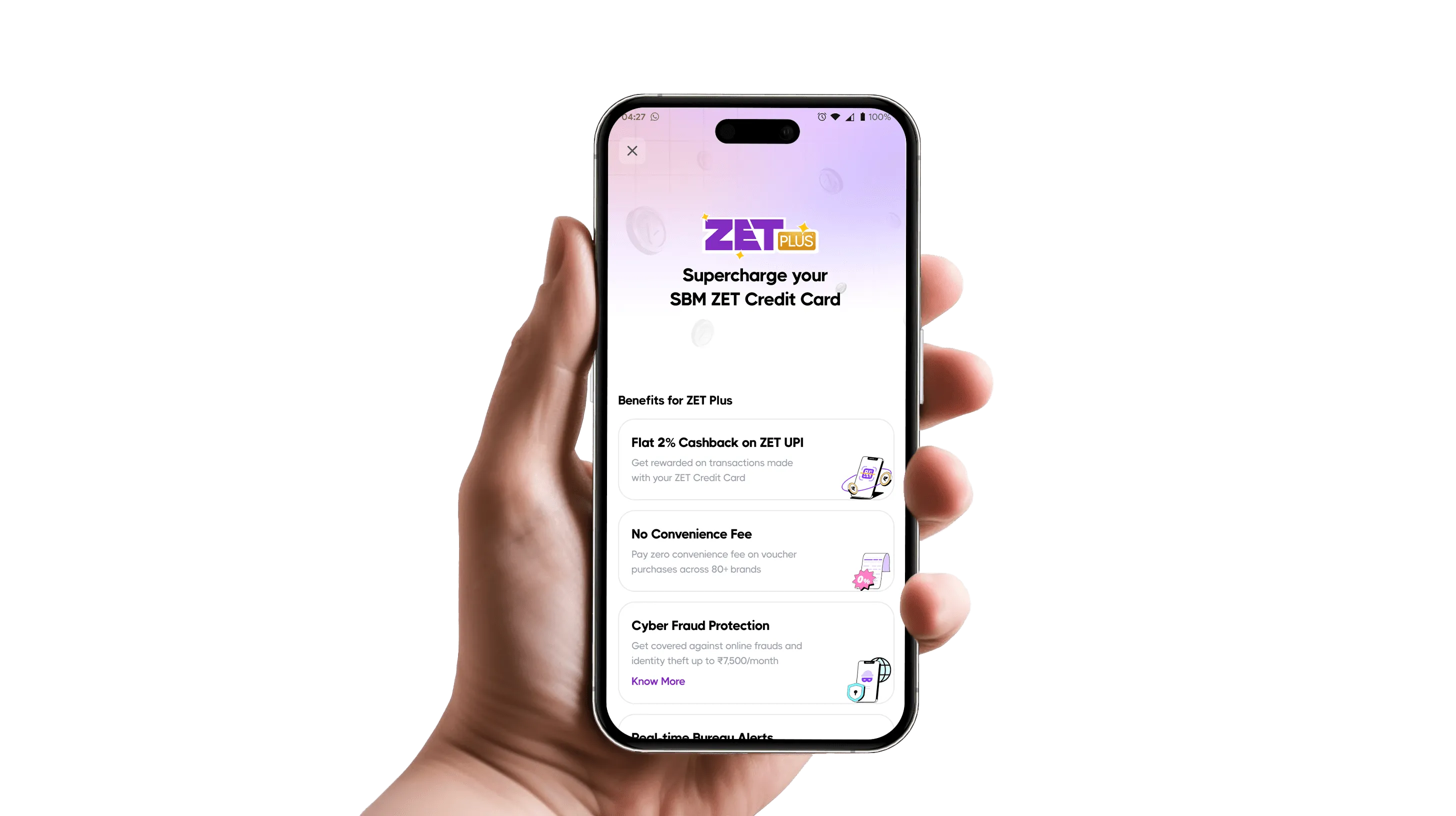 ZET Plus is a subscription at just ₹3/day that maximises rewards and offers additional benefits with your ZET FD Credit Card: - 2% cashback on every ZET UPI transaction. - No convenience fees on voucher purchases. - Lifetime validity on ZCoins. - Protection against online fraud and identity theft. - Dark web monitoring to secure your personal data.